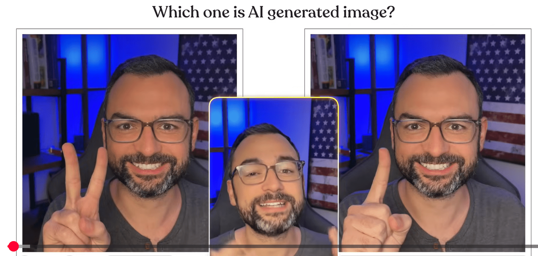 The image in the middle is the actual person. Is the image on the right or the image on the left AI generated? (answer at the bottom)